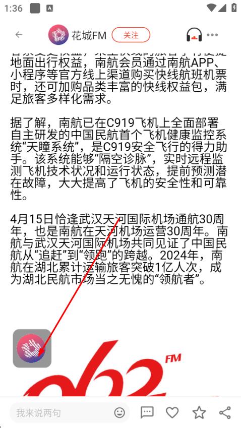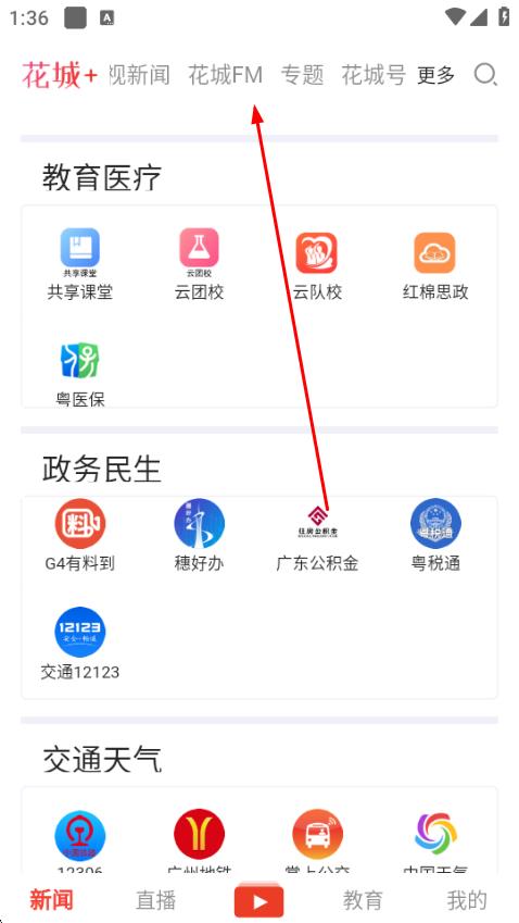 1、打開(kāi)花城+App,點(diǎn)擊首頁(yè)上方的花城FM選項(xiàng)。