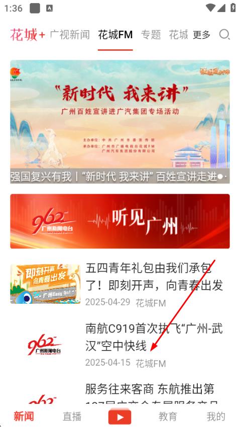 2、進(jìn)入花城FM頁(yè)面后,瀏覽新聞報(bào)道列表,找到你想聽(tīng)的新聞點(diǎn)擊進(jìn)入。