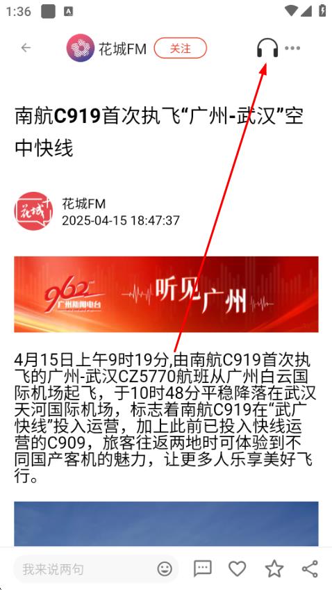 3、在新聞詳情頁(yè)面,點(diǎn)擊右上角耳機(jī)形狀的播放按鈕,即可收聽(tīng)新聞報(bào)道內(nèi)容。