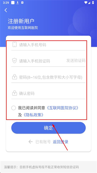 2、進入注冊新用戶頁面,輸入手機號碼,點擊“發(fā)送驗證碼”并填入收到的驗證碼,設置8-16位包含數字和大小寫字母的密碼,再次確認密碼,勾選協議及隱私政策。