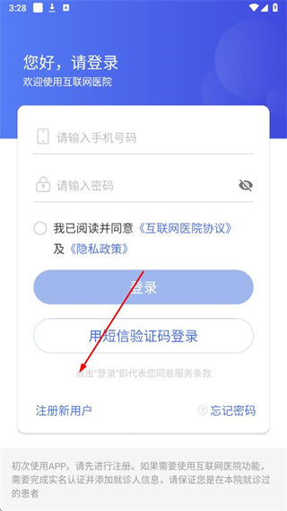 1、打開武大云醫(yī)APP,在登錄頁面點擊注冊新用戶。