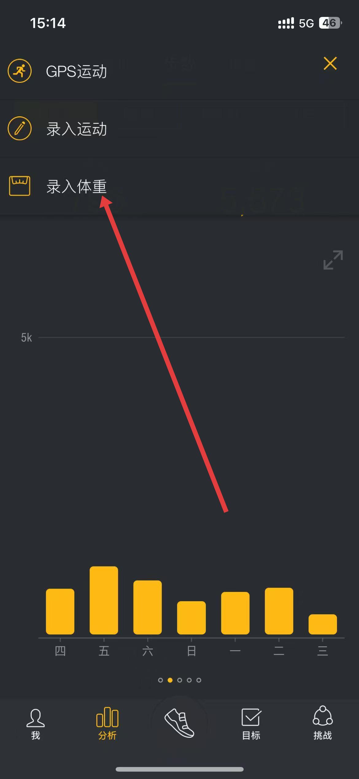 3、在彈出的菜單中,選擇錄入體重選項(xiàng)。