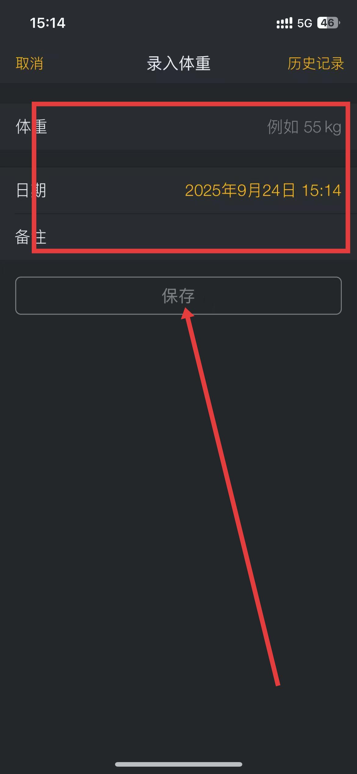 4、填寫信息后點(diǎn)擊保存按鈕,即可完成體重錄入。