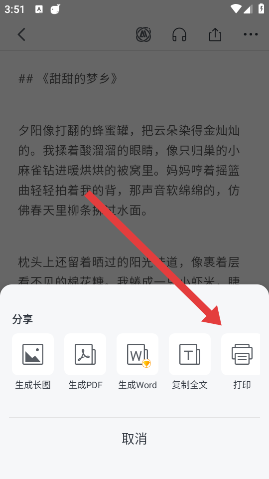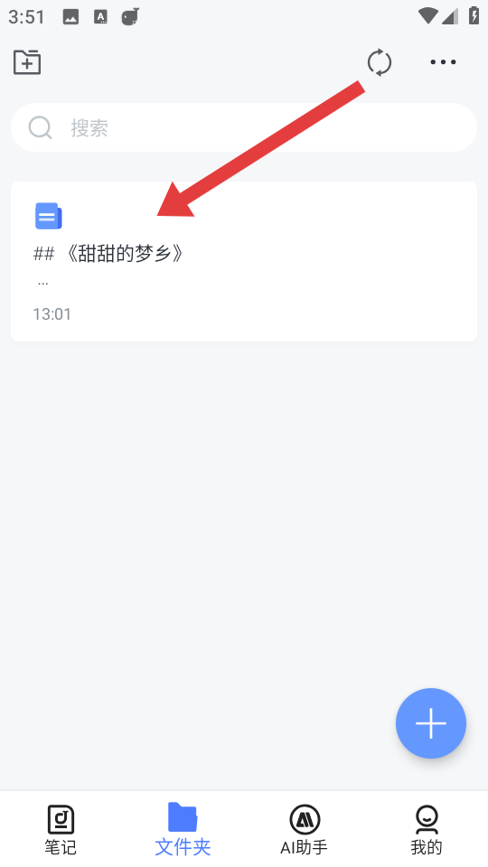 1、打開訊飛語記APP,進(jìn)入文件夾的頁面,點(diǎn)擊要打印的作文如甜甜的夢鄉(xiāng),進(jìn)入作文詳情的界面。