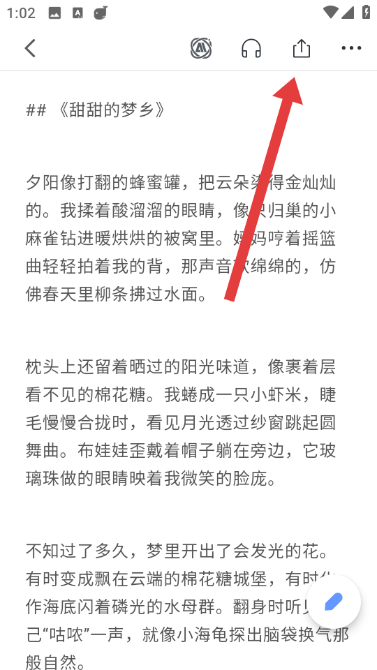 2、進(jìn)入要打印的作文筆記詳情頁,然后點(diǎn)擊右上角分享的圖標(biāo),彈出功能菜單。