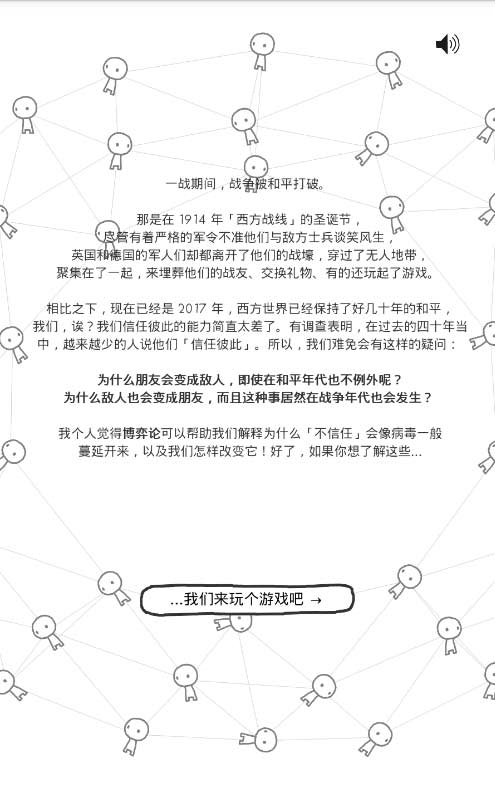 進(jìn)入游戲后,就有一個沉重而現(xiàn)實的問題擺在我們面前,不管是在戰(zhàn)爭年代還是在和平年代,甚至在當(dāng)前我們生活的2017年,人與人之間彼此的信任太差了,朋友也會變成敵人,這是為什么?如果你想要了解這些問題,那么就開始玩?zhèn)€游戲吧↓
