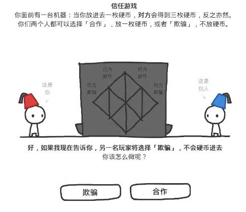 游戲開始的玩法很簡單,在「欺騙」與「合作」做個選擇。當(dāng)你和你的對手分別投出1元硬幣,你們將同時獲得2枚硬幣。若你或你的對手不投硬幣,而對方投入了硬幣,則不投硬幣者將獲得3枚硬幣,投硬幣的人將損失一枚硬幣,若2人都不投硬幣,則均無收獲。你會做出什么選擇?