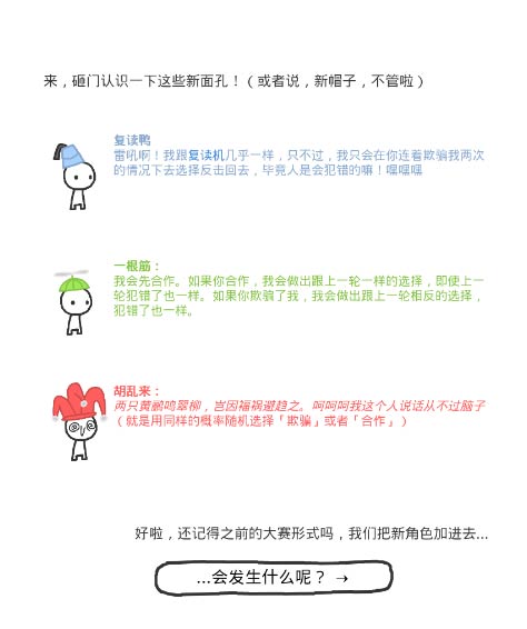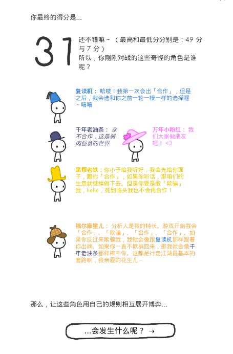 被老油條欺騙成功了一次,我面對小粉紅時謹(jǐn)慎了很多,粉色帽子可能是一位女性,游戲里的女性可能是好人吧?我和小粉紅合作了兩次,第三次由于我被老油條騙了一次我為了補(bǔ)償回來,我選擇了欺騙。
