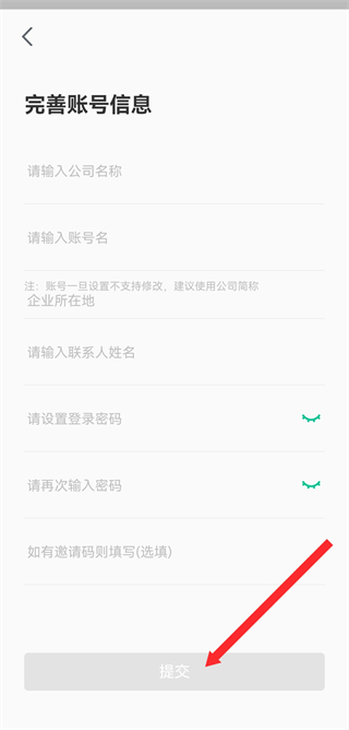 3、進(jìn)入完善賬號信息頁面,輸入信息后,點(diǎn)擊提交完成注冊操作。