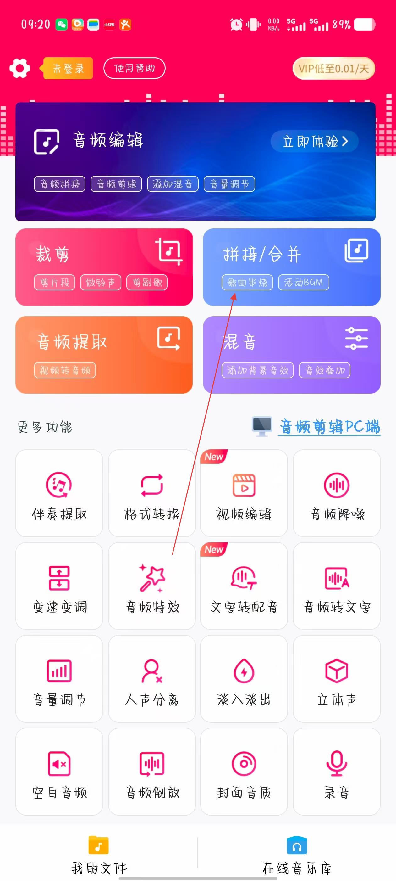1、打開音頻編輯工具,點(diǎn)擊界面中的拼接/合并板塊,進(jìn)入音頻拼接合并流程。