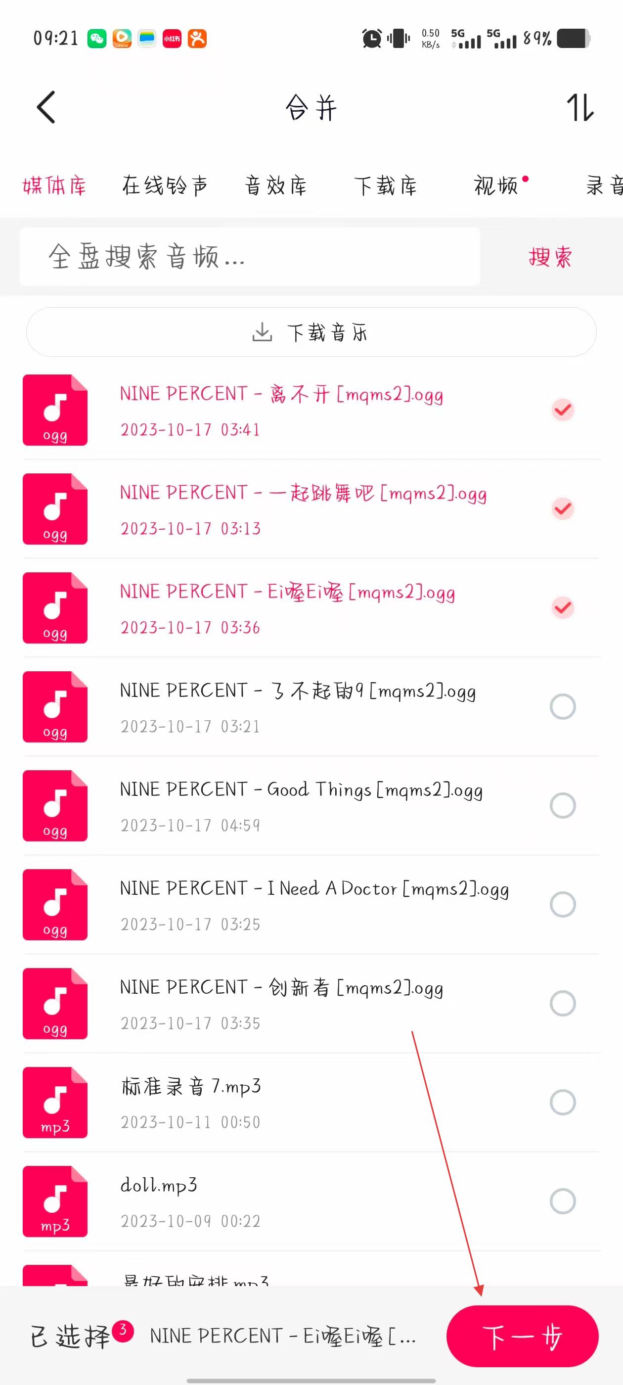 2、在合并界面,挑選需拼接合并的多段音頻,選好后點(diǎn)擊界面下方下一步。