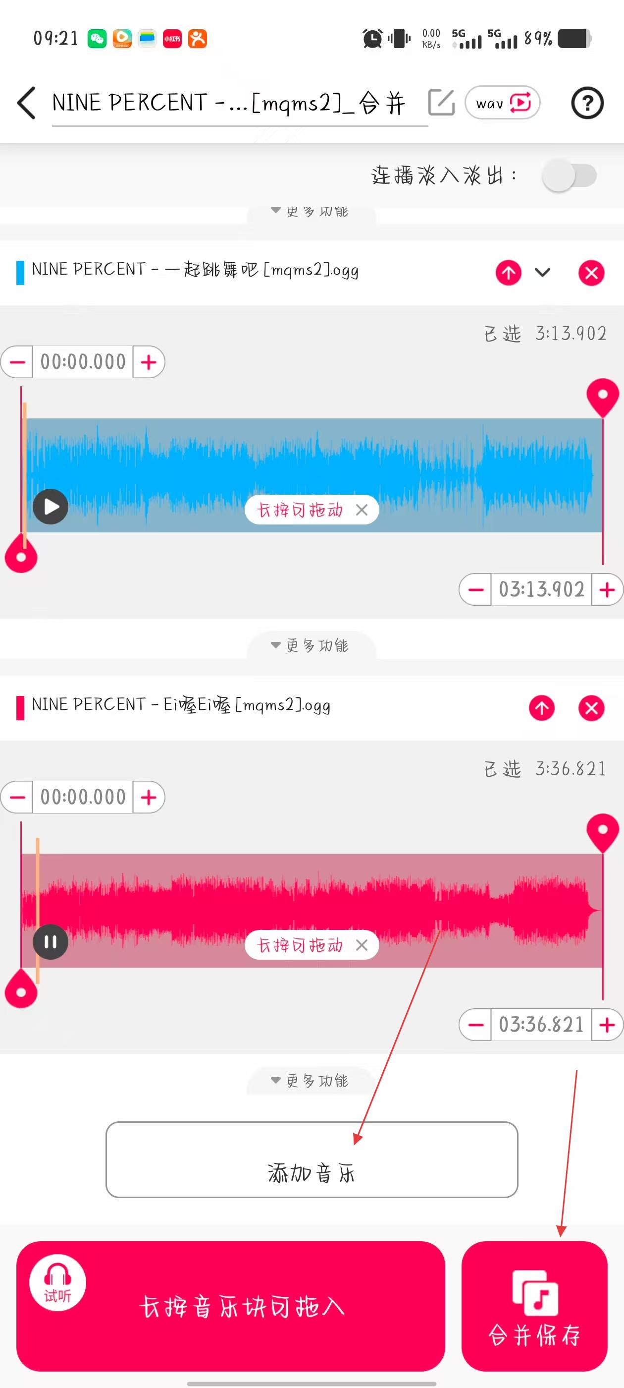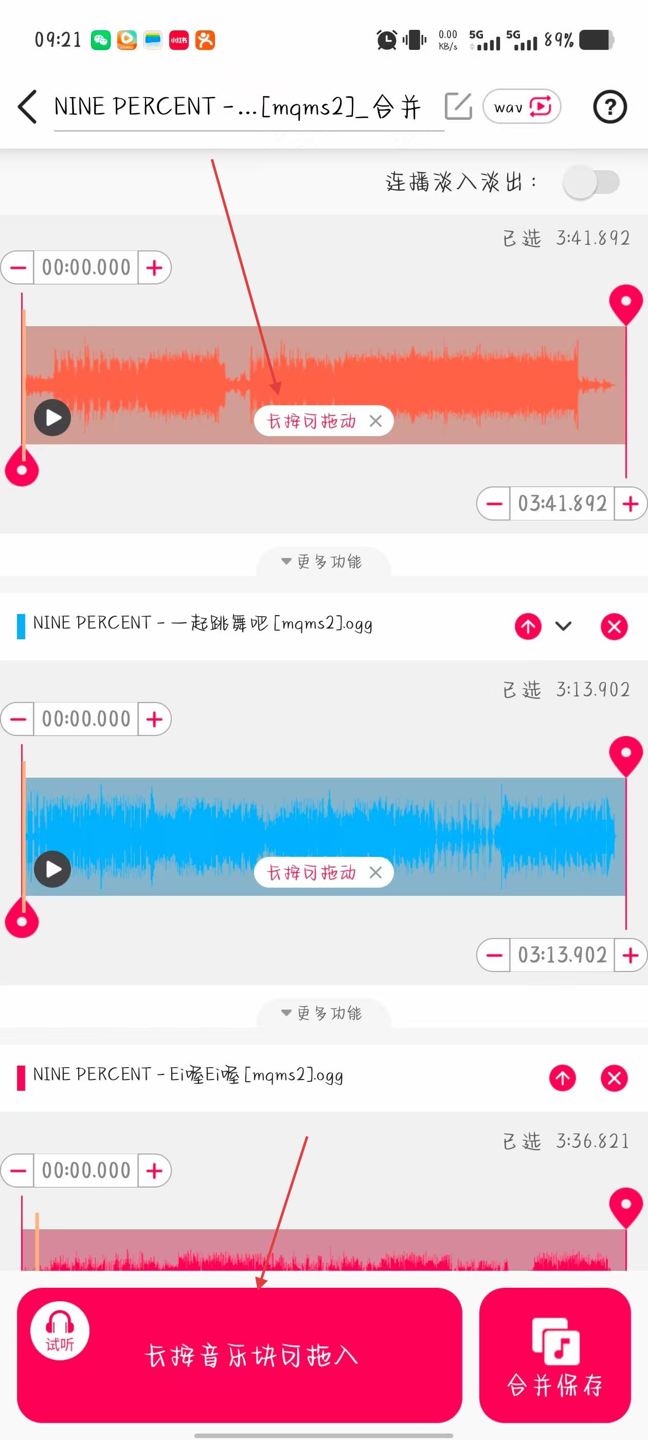 3、進(jìn)入音頻合并編輯界面,長(zhǎng)按音樂(lè)塊可拖動(dòng)調(diào)整多段音頻的排列順序,長(zhǎng)按還能拖入下方試聽。
