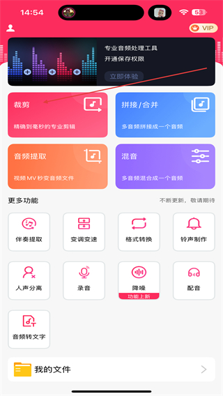 1、打開音頻音樂(lè)剪輯的APP,進(jìn)入首頁(yè)點(diǎn)擊裁剪的功能按鈕。