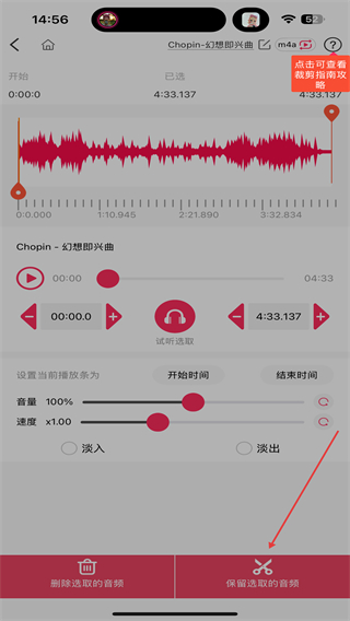 4、進(jìn)入裁剪的界面內(nèi),裁剪后再點(diǎn)擊保留選取的音頻即可。