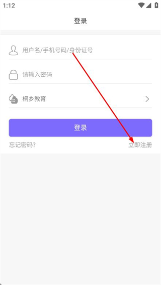 1、打開桐鄉(xiāng)教育app,在登錄頁面點擊立即注冊按鈕。