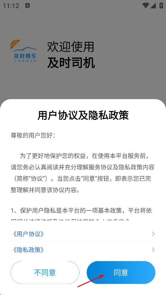 1、打開及時司機應用,進入用戶協(xié)議及隱私政策頁面,認真閱讀內容后,點擊“同意”按鈕,接受協(xié)議條款。