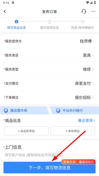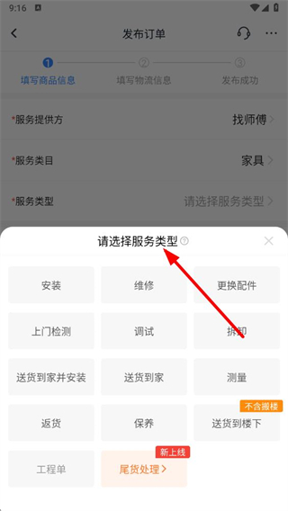 3、在發(fā)布訂單頁面選擇服務(wù)類型和支付模式,填寫商品信息和上門信息。