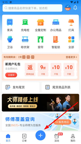 1、在萬師傅app首頁點擊底部的按鈕,進(jìn)入下單服務(wù)類目選擇頁面。