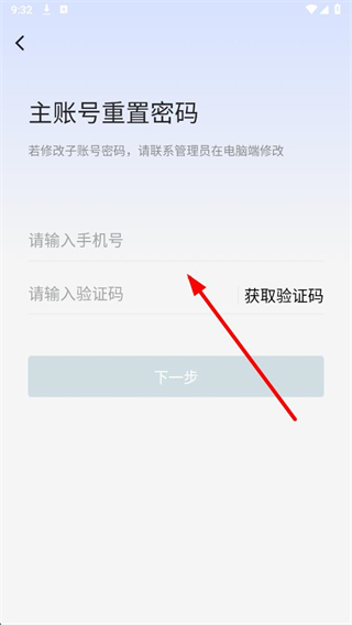 4、在主賬號重置密碼頁面,輸入手機(jī)號和驗證碼,點擊下一步按鈕,按提示完成密碼重置操作。