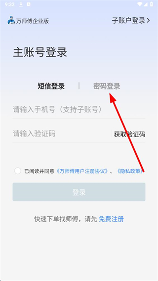 2、在主賬號登錄頁面,點擊密碼登錄選項,切換到密碼登錄界面。