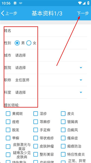 3、填寫姓名、選擇性別、城市、醫(yī)院、職稱、科室,勾選擅長(zhǎng)領(lǐng)域,點(diǎn)擊下一步。