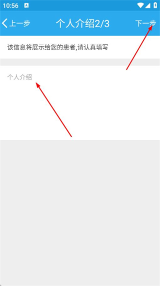 4、在個(gè)人介紹頁(yè)面填寫個(gè)人介紹后點(diǎn)擊下一步。
