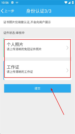 5、在身份認(rèn)證頁(yè)面上傳清晰的免冠證件照片和工作證照片,點(diǎn)擊提交,完成賬號(hào)注冊(cè)流程。