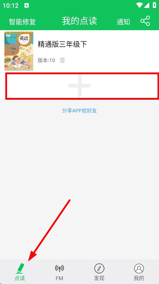 1、點擊底部導(dǎo)航欄中的點讀選項,在我的點讀頁面中,點擊空白處的+圖標(biāo),