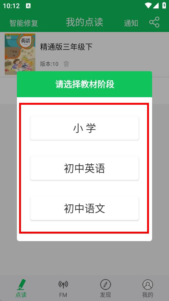 2、彈出請選擇教材階段窗口,選擇小學(xué)、初中英語或初中語文等教材階段。