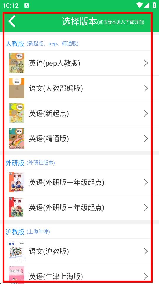 3、選擇教材階段后,進入選擇版本頁面,在該頁面中點擊想要的教材版本,進入下載頁面完成選書操作。