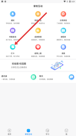 3、登錄完成后,切換至家?;?dòng)界面,找到并點(diǎn)擊打卡圖標(biāo),進(jìn)入打卡頁面,按提示完成打卡任務(wù)。