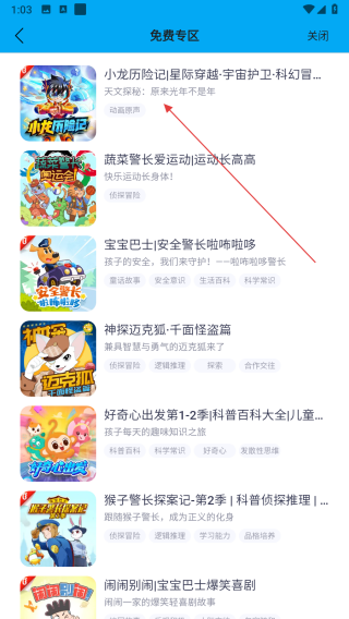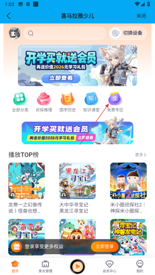 2、在喜馬拉雅少兒頁(yè)面中,找到免費(fèi)專區(qū)按鈕并點(diǎn)擊,進(jìn)入免費(fèi)音頻書籍列表頁(yè)面。