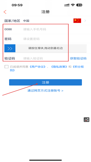 4、輸入手機(jī)號(hào)、密碼以及驗(yàn)證碼,再點(diǎn)擊注冊(cè)即可。