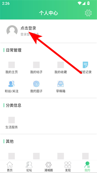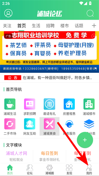1、打開浦城論壇APP,點(diǎn)擊右下角我的,進(jìn)入個(gè)人中心頁面。