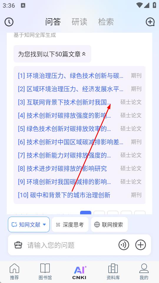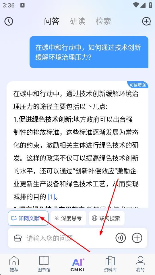 1、打開全球?qū)W術(shù)快報App,進入AI問答界面,輸入問題獲取答案后,點擊知網(wǎng)文獻。