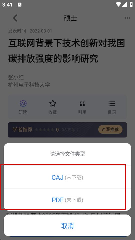 4、彈出請選擇文件類型的窗口后,選擇想要下載的文件格式,比如CAJ或PDF,完成論文下載。