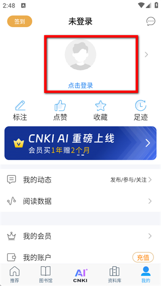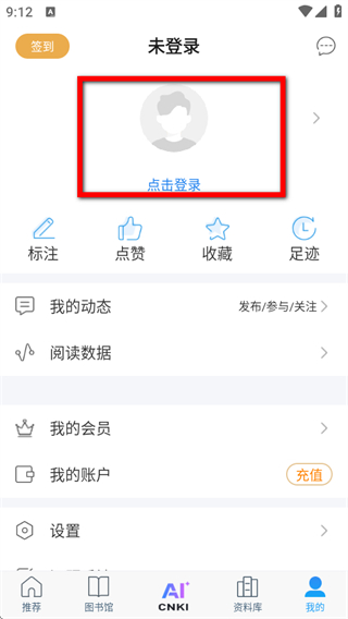 1、在全球?qū)W術(shù)快報個人界面,點擊點擊登錄區(qū)域,進入登錄選擇頁面。