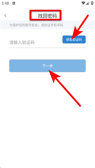 4、在驗證碼驗證頁面,點擊獲取驗證碼按鈕,輸入驗證碼后點擊下一步按鈕,即可進行密碼找回操作。