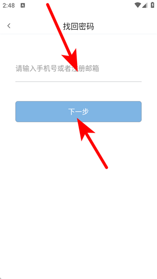 3、在找回密碼頁面,輸入手機號或注冊郵箱后點擊下一步按鈕,進入驗證碼驗證頁面。