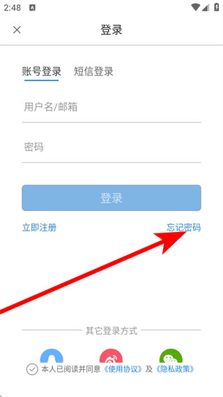 2、在登錄選擇頁面,點擊忘記密碼選項,進入找回密碼頁面。