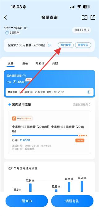 2、在余量查詢頁面,點擊我的套餐選項,進入套餐詳情頁面。