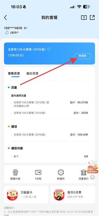 3、在套餐詳情頁面,點擊換套餐按鈕,進入套餐專區(qū)。
