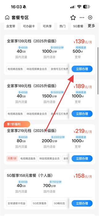 4、在套餐專區(qū)選擇心儀的套餐,點擊立即辦理,完成套餐更換。