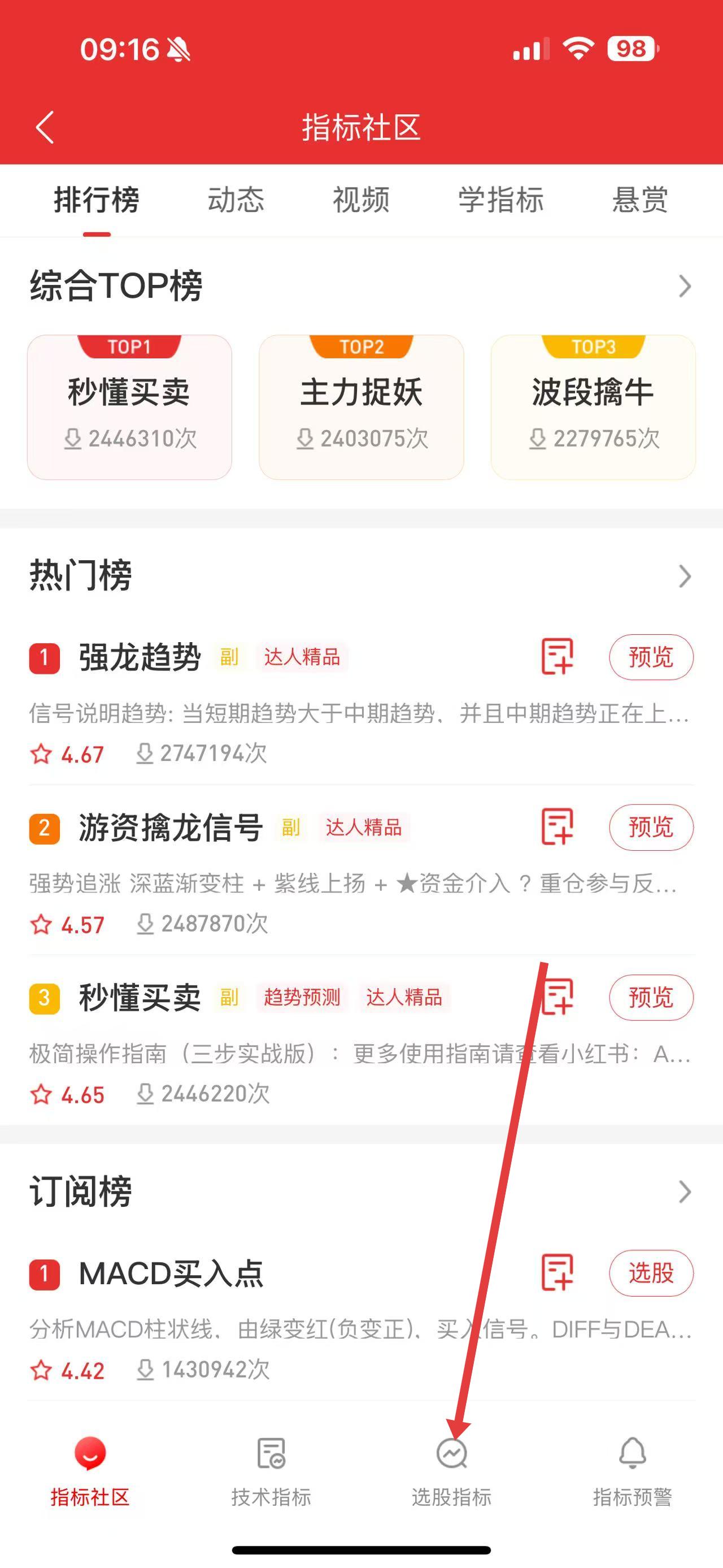 1、打開(kāi)通達(dá)信應(yīng)用,進(jìn)入指標(biāo)社區(qū)頁(yè)面,點(diǎn)擊底部的選股指標(biāo)。