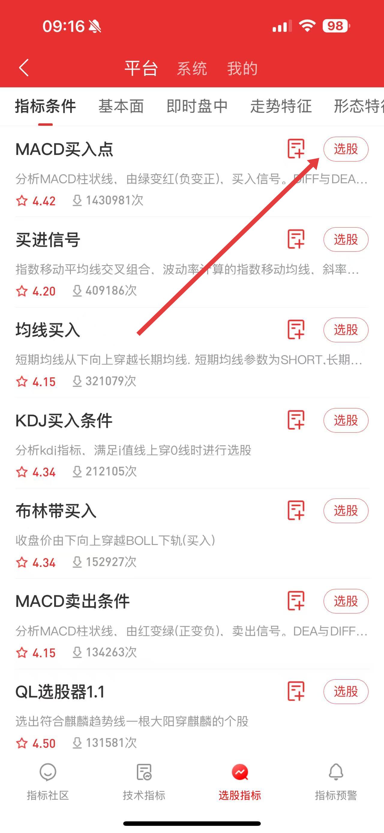 2、在選股指標(biāo)頁(yè)面,瀏覽指標(biāo)列表,選擇如MACD買入點(diǎn)等心儀的選股指標(biāo),點(diǎn)擊其右側(cè)的選股按鈕。
