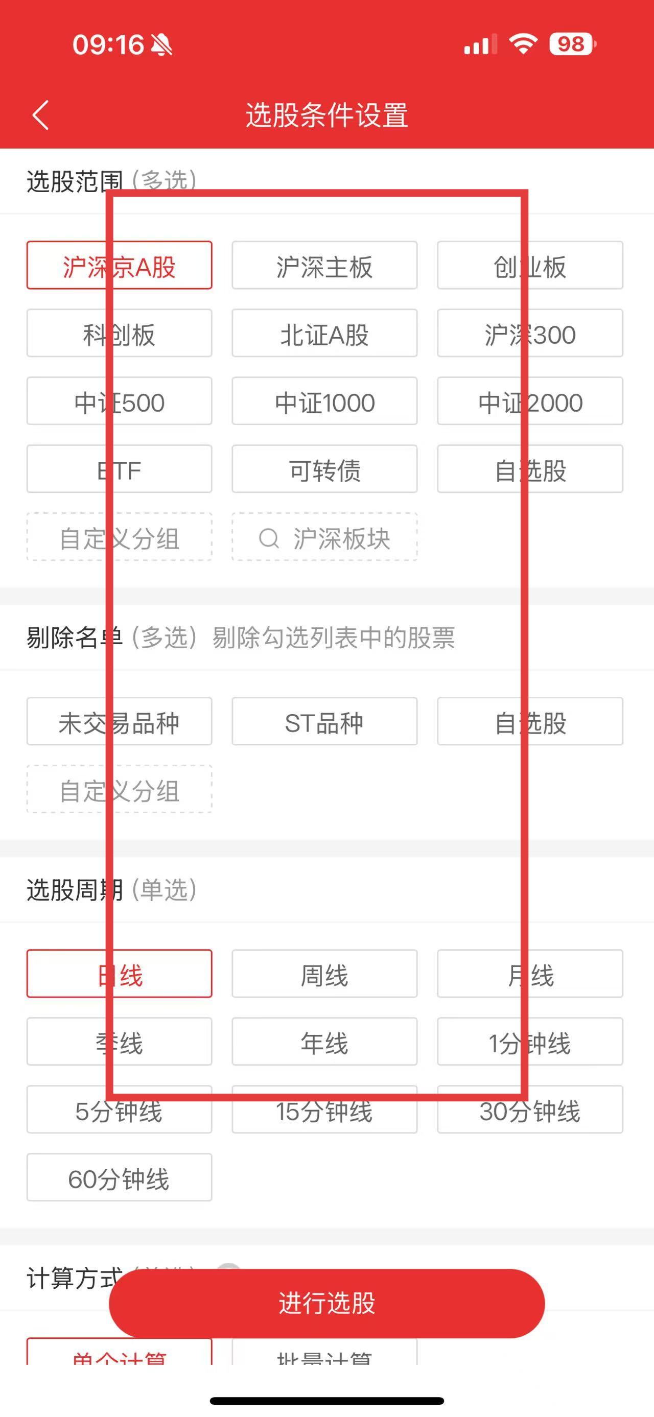 3、進(jìn)入選股條件設(shè)置頁(yè)面,設(shè)置選股范圍、剔除名單、選股周期等條件后,點(diǎn)擊進(jìn)行選股。