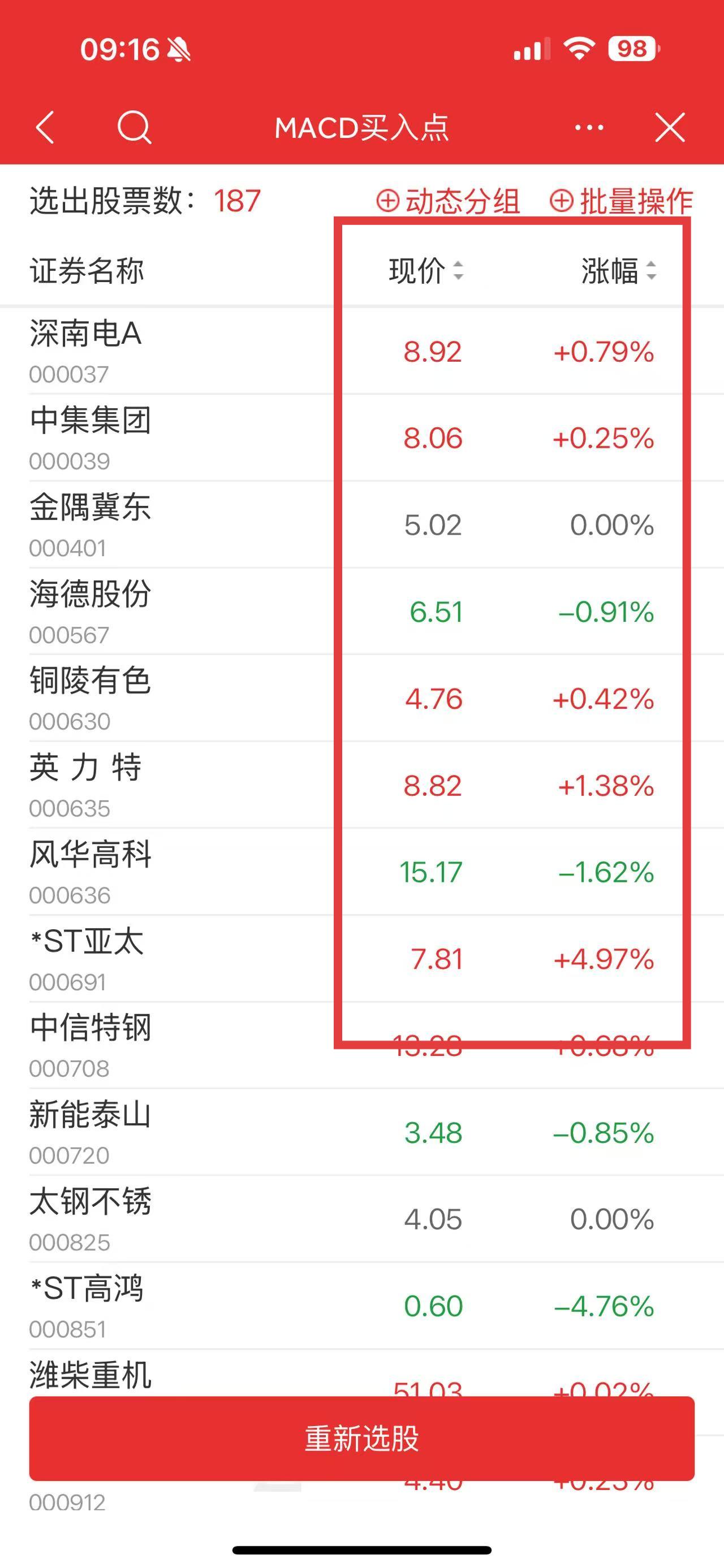 4、選股完成后,查看選出的股票列表,參考現(xiàn)價(jià)、漲幅等數(shù)據(jù)篩選股票。