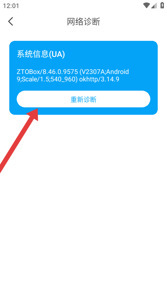 2、在登錄前需要進入網(wǎng)絡(luò)診斷的頁面,點擊重新診斷,獲取系統(tǒng)信息UA,檢測網(wǎng)絡(luò)狀態(tài)。