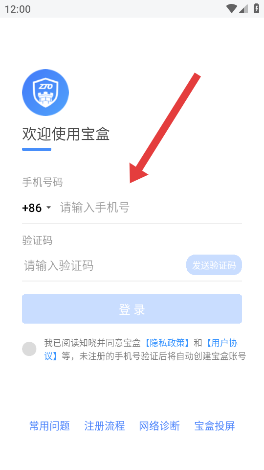 3、在寶盒登錄頁,輸入手機號碼、驗證碼,勾選協(xié)議后點擊登錄,未注冊手機號驗證后自動創(chuàng)建賬號。