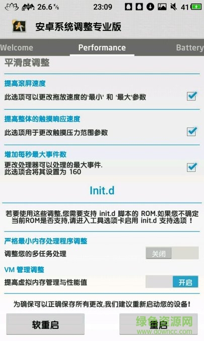 安卓調(diào)整專業(yè)版 Android Tweaker Pro是款系統(tǒng)優(yōu)化工具,需要root權(quán)限,能對多個(gè)系統(tǒng)參數(shù)進(jìn)行設(shè)置和調(diào)整。包括apk優(yōu)化、內(nèi)核調(diào)整、GPS設(shè)置、音頻音量調(diào)整、圖像質(zhì)量調(diào)整、網(wǎng)速提升、節(jié)能等。
